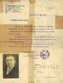 Nils Olof Holger Harring, sjökapten född 1888 i Simrishamn. Hans far var kyrkoherde. Efter studentexamen i Lund 1908 studerade Nils till tandläkare och tog en odontologie kandidatexamen i Stockholm. Han lämnade dock denna bana i oktober 1911 och tog tjänst som jungman. Han arbetade till sjöss under hela 1910-talet, inklusive under första världskriget. Han tog sen styrmans- och sjökaptensexamen vid Navigationsskolan i Göteborg 1919 respektive 1920.