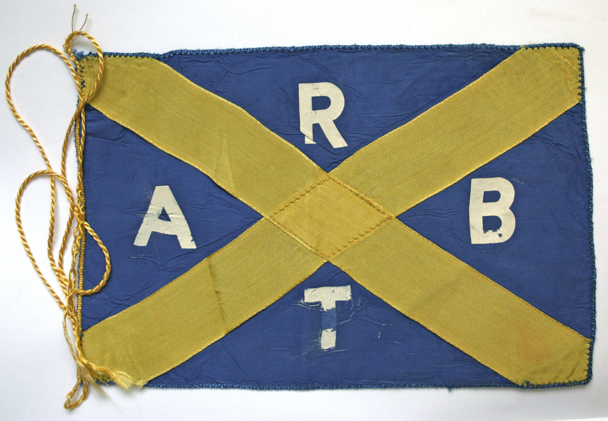 Bordsflagga av blått dubbelt tyg med ett gult påsytt diagonalt kryss. Kantsydd med insydd blå lina runt de fria kanterna och med gul förlängd lina längs stångkanten. I de blå fälten är bokstäverna A, B, R och T tryckta med vit färg.