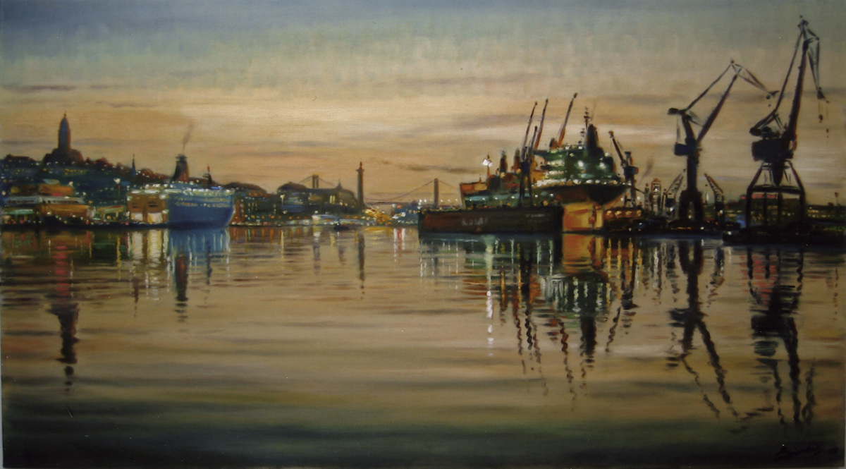 Konstnärens text: Jag har alltid älskat och varit fascinerad av hamnmiljöer, att försöka fånga vattenspeglingar, ljus och stämningar. Fukten i luften, diset. En hamn är alltid i rörelse och förändring.