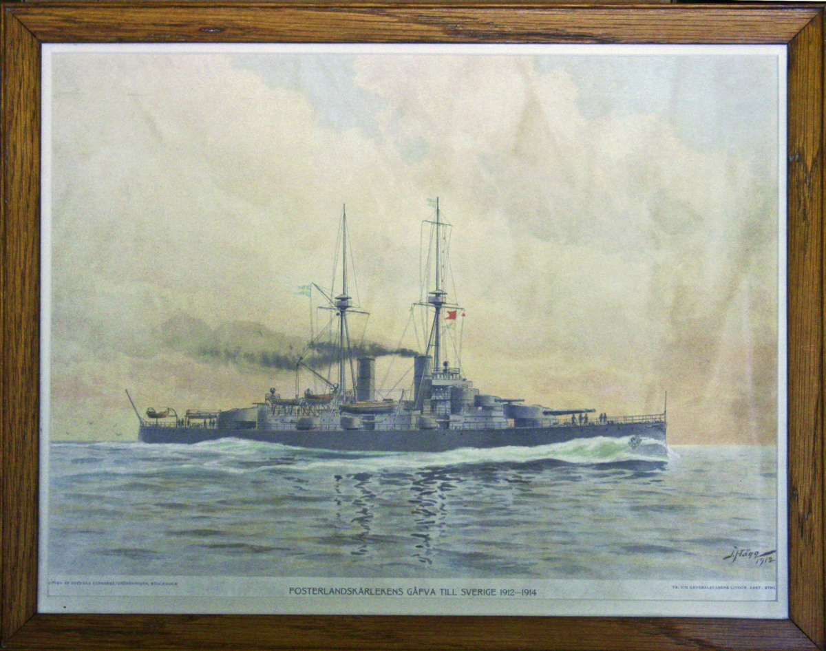 Den färglitografiska bilden visar ett grått krigsfartyg mot gulaktig himmel och grått lugnt hav. Fartyget försett med två master och två skorstenar. Bilden signerad i stenen J. Hägg 1912. Bilden inramad med en något profilerad omålad ekram.
