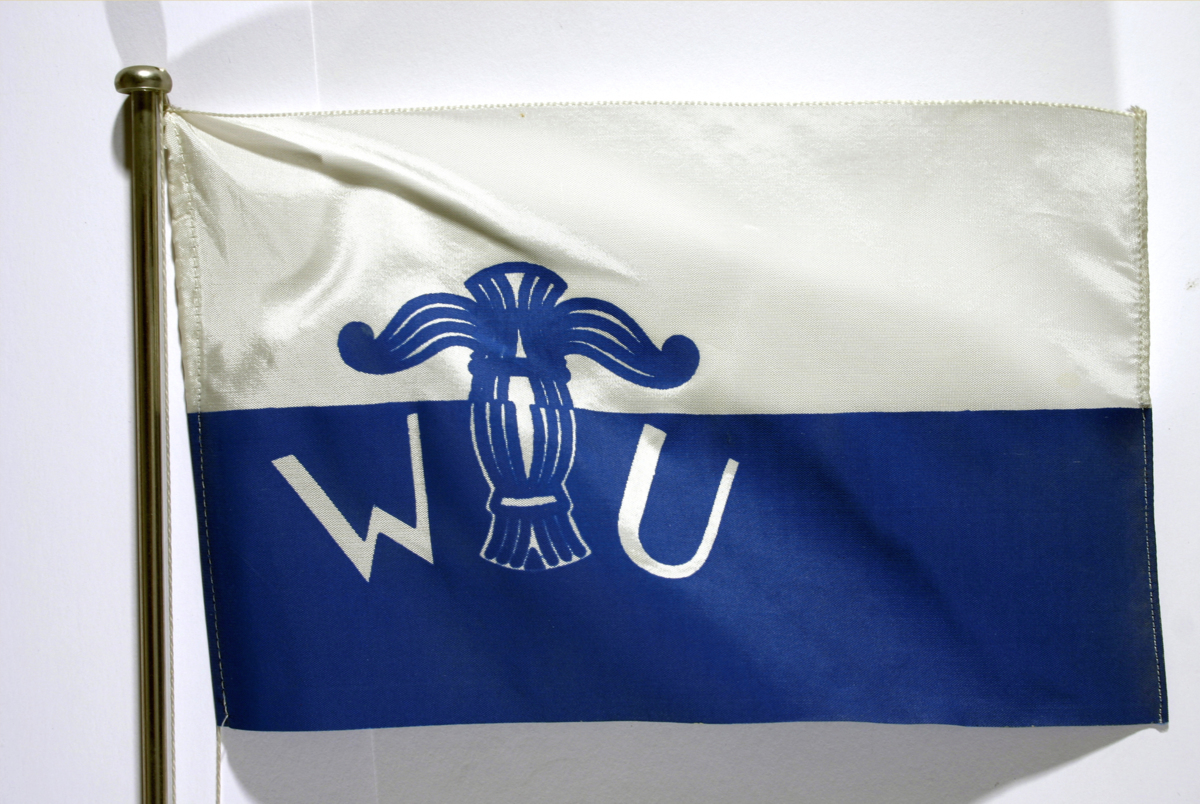 Bordsflagga av vit konstfiber med sydd kant, utom nederkanten. Nedre delen med blått tryck som tillsammans med det vita övre fältet bildar ett W och en Wasakärve samt ett U.