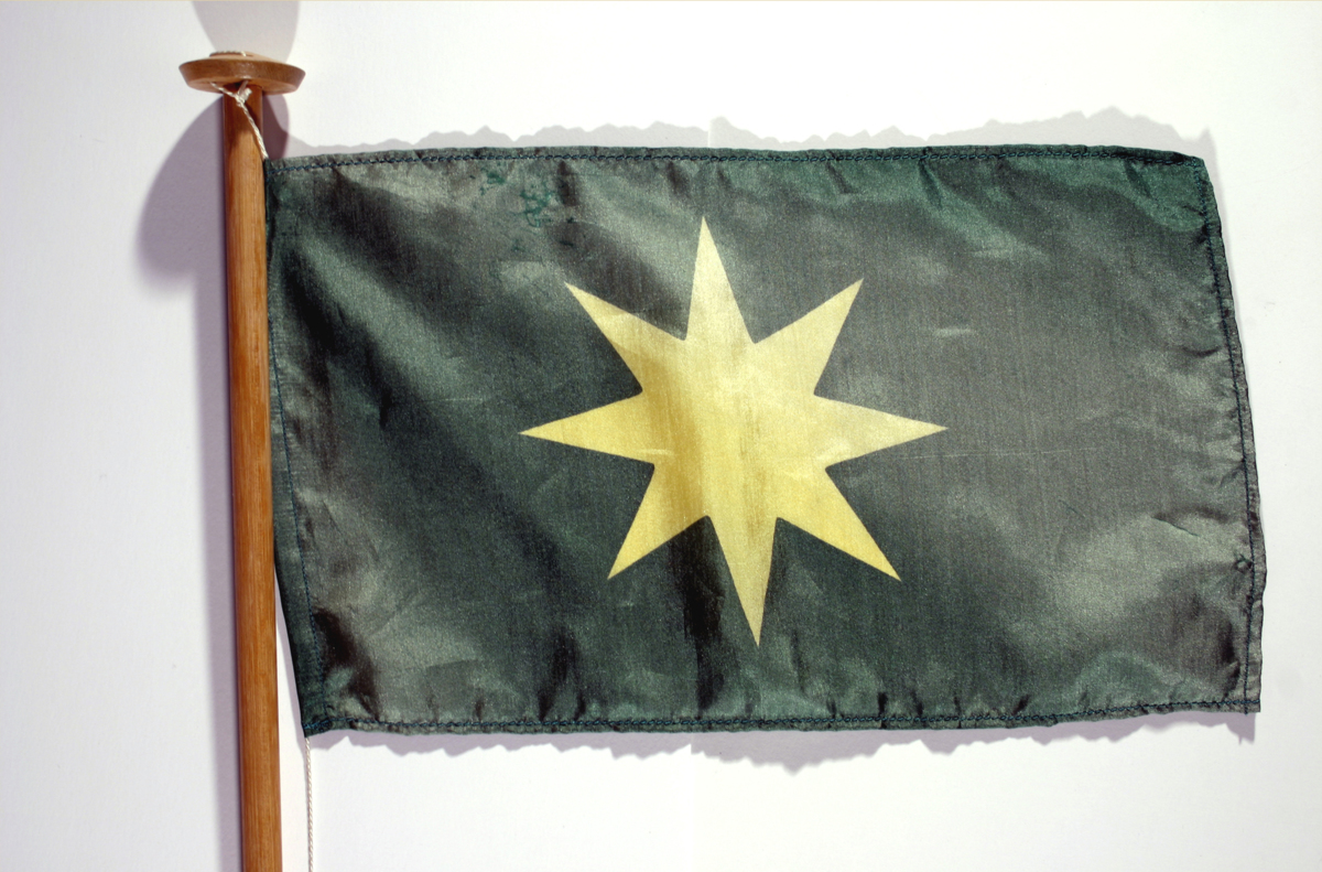 Flagga av siden fållad runt om med en lina insydd i ena kanten. Åttauddig gul stjärna på grön botten.