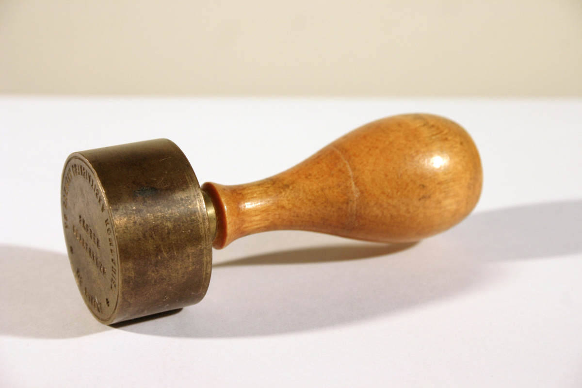 Rund lackstämpel av mässing med svarvat träskaft.