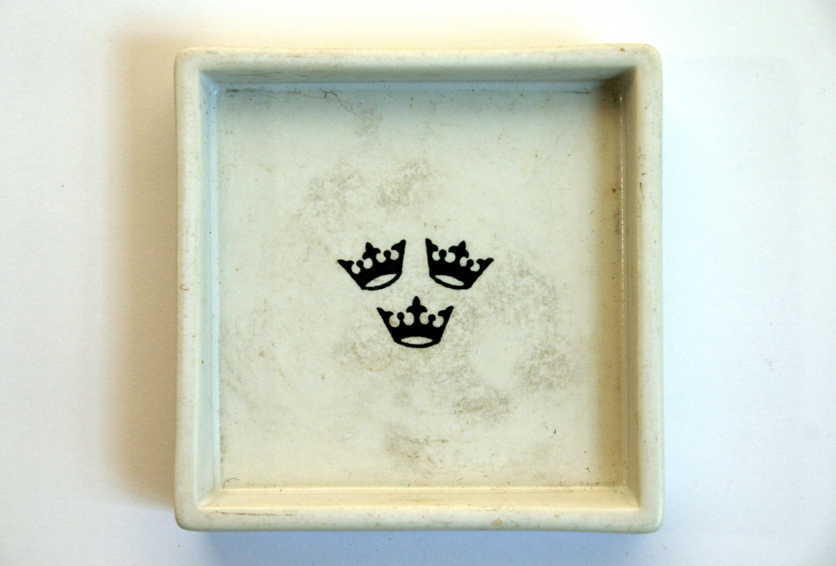 Kvadratiskt askfat med raka kanter. Matt vit glasyr med tre kronor i oxiderad metall i centrum av botten. På baksidan Gustavsbergs logo i guld och texten 'SPECIALLY DESIGNED FOR SWEDISH AMERICAN LINE'.