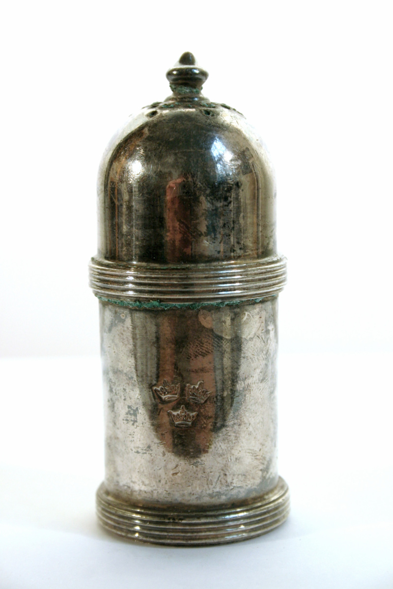 Saltstörare av metall rund med rundad överdel som avlutas med en knopp. Runt knoppen ströarhål placerade som en stjärna. På sidan är tre kronor stansade. Under är Genses logotyp och texten 'EXTRA' stansade.