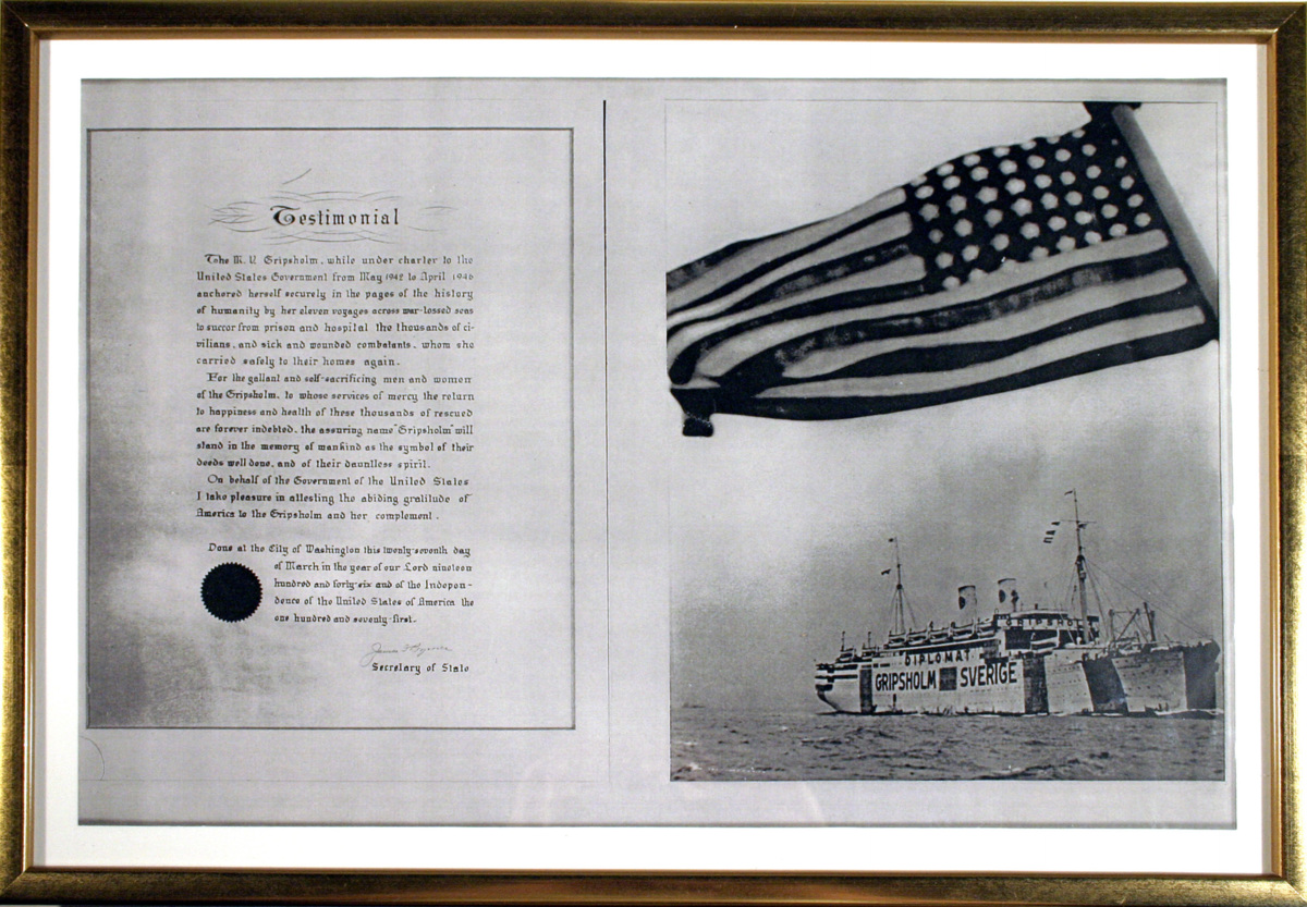 Fotokopia av 'Testimonial'' samt bild av Gripsholm under en Amerikansk flagga. Testimonial. The M. V. Gripsholm, while under charter to the United States Governent from May 1942 to April 1946 anchored herself securely in the pages of the history of humanity by her eleven voyages across war-tossed seas to succor form prison and hospital the thousands of civilians, and sick and wounded combatants, whom she carried safely to their homes again. For the gallant and self-sacrificing men and women of the Gripsholm, to whose services of mercy the return to happiness and health of these thousands of rescued are forever indebted, the assuring name 'Gripsholm' will stand in the memory of mankind as the symbol of their deeds well done, and of their dauntless spririt. On behalf of the Government of the United States I take pleasure in attesting the abiding gratitude of America to Gripsholm and her complement. Done at the City of Washington this twenty.seventh day of March in the year of our Lord nineteen hundered and forty-six and of the Independencd of the United States of America the one hundred and seventy-first. James ? Secretary of State