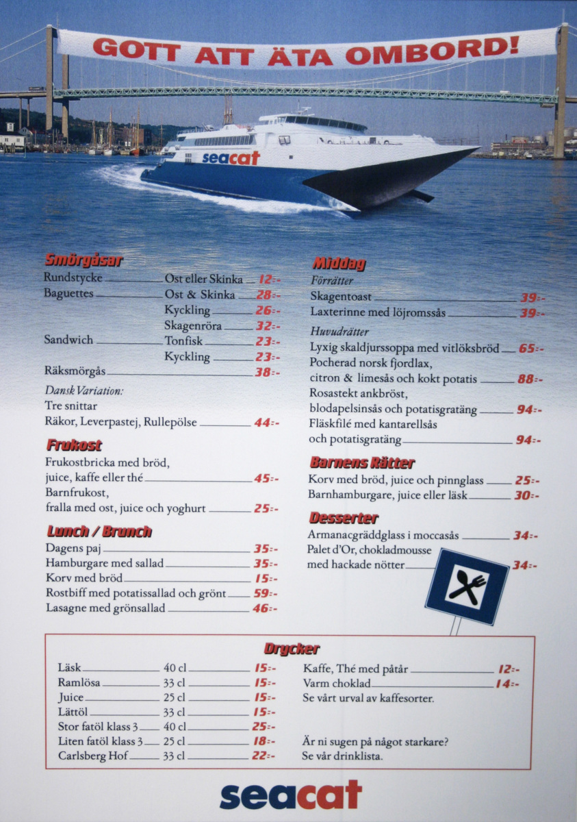 Prislista med rubriken 'Gott att äta ombord'. Under rubriken är 'Seacat Danmark' avbildad framför Älvsborgsbron. Under bilden kommer prislistan och längst ner finns bolagets logga bestående av texten 'seacat' i rött och blått.