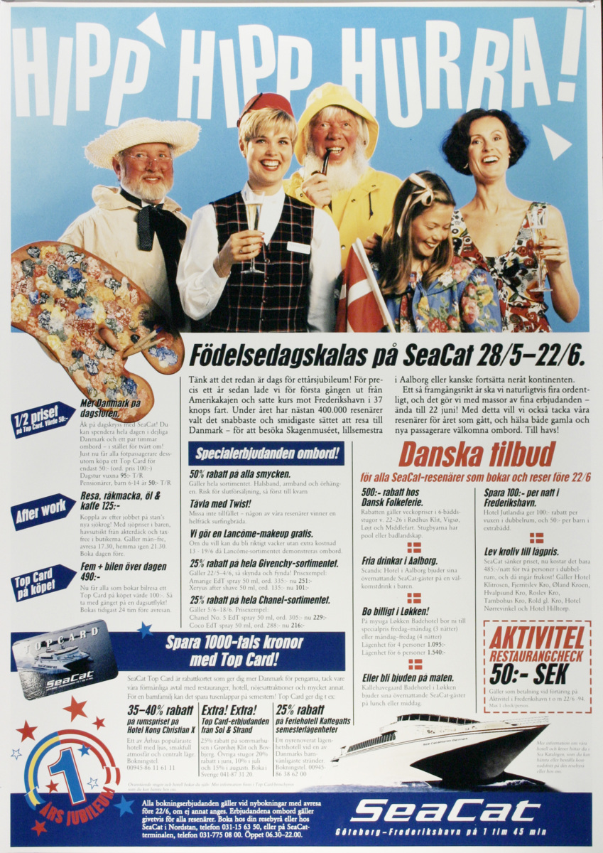 Reklamaffisch för resor med rederiet Seacat under deras födelsedagskalas - deras ettårsjubileum under slutet av maj och juni 1994.