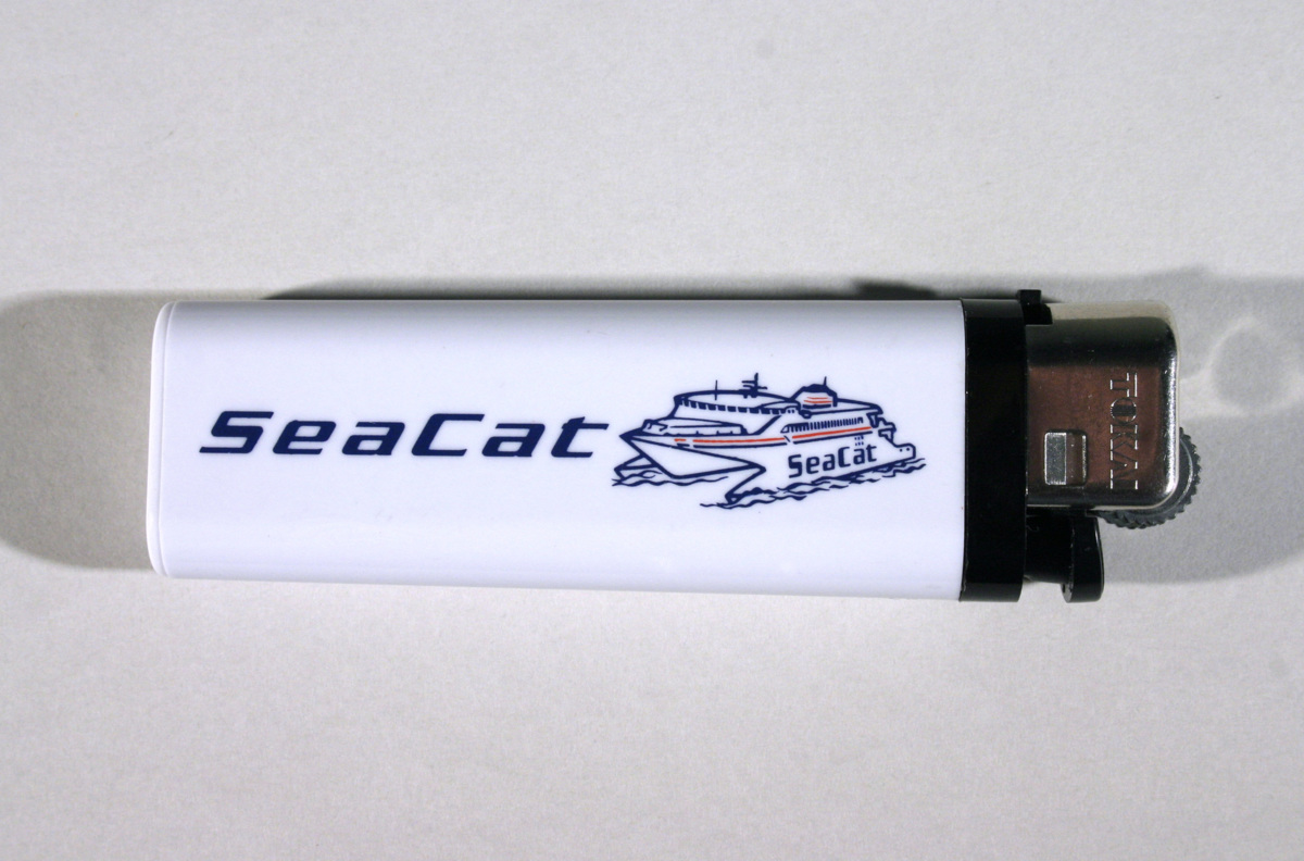 Cigarettändare med gasbehållare av vit plast och tändardel av svart plast med metalldelar. På den vita gasbehållaren står 'SeaCat' och en bild på en katamaranfärja. Brännbar gas är avlägsnad.