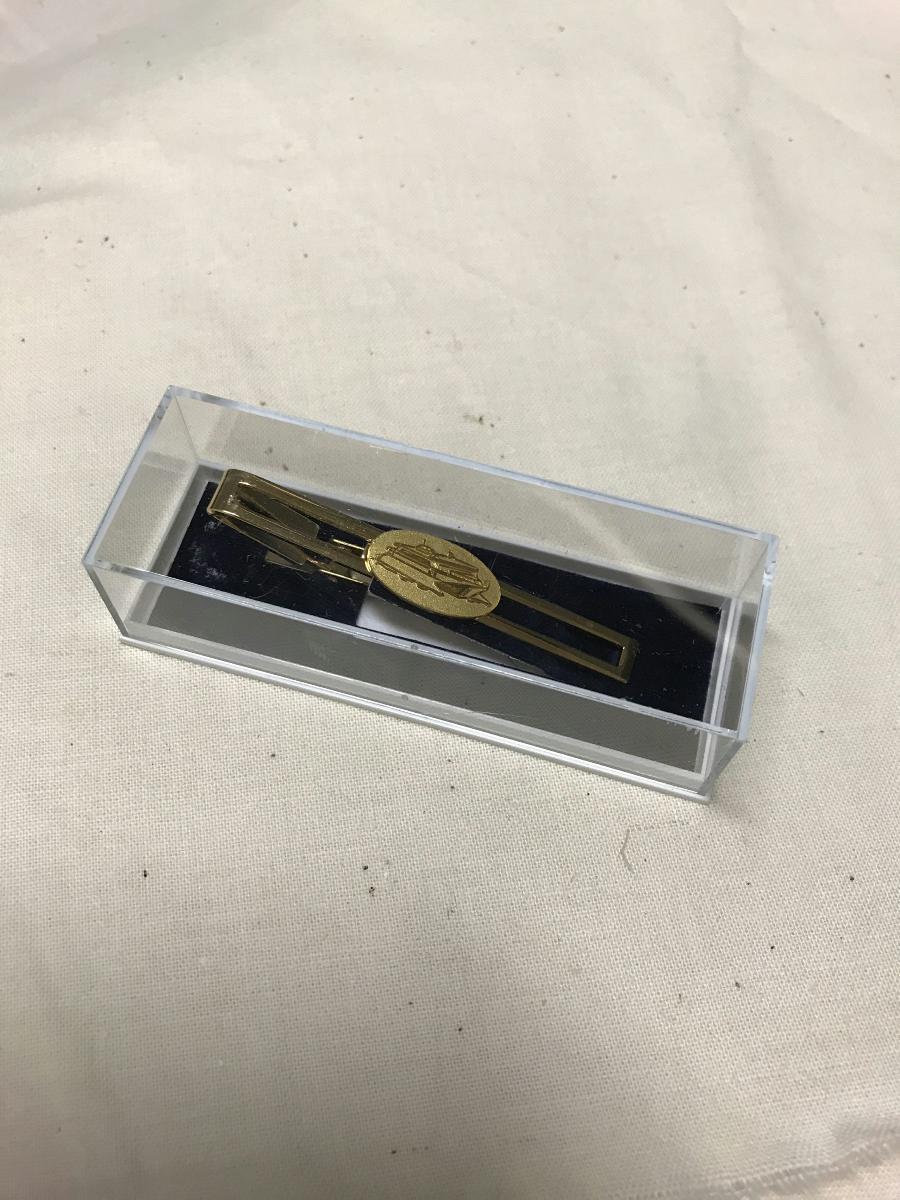 Slipshållare av gulmetall med långsmal rektangulär framsida av en 2 mm ram. Mitt på framsidan sitter en medaljong med en avbild av en catamaranfärja. På baksidan en tvåledad fjäderklamma som klämmer mot framsidan. Hållaren ligger i en tvådelad förpackning av plast med genomsynlig överdel.