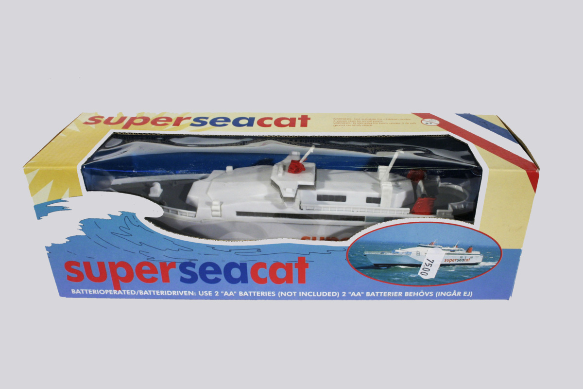 Leksaksbåt tillverkad av vit plast och uformad som en Superseacat. Blått undervattenskrov, röda skorstenar och grå däck. På sidorna står 'superseacat' i rött och blått. Båten är försedd med ett batteridrivet vattenjetaggregat. Båten är förpackad i en kartong med måtten L 32; B 10; H 10 cm. På kartongen finns bruksanvisning, originalets tekniska specifikation och texten 'Tillverkad för martinex, box 2116, S 113 30 Stockholm'.
