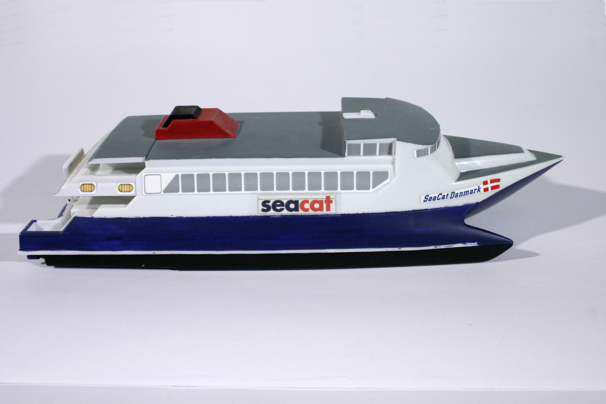 Leksaksbåt tillverkad blå och vit plast som en modell av Seacat Danmark. Båten är i efterhand målad med blå, grå, svart och röd färg. Fartygsnamn och rederinamn påtejpade. På undersidan av båten finns en fästanordning för ett batteridrivet motorpaket (saknas).