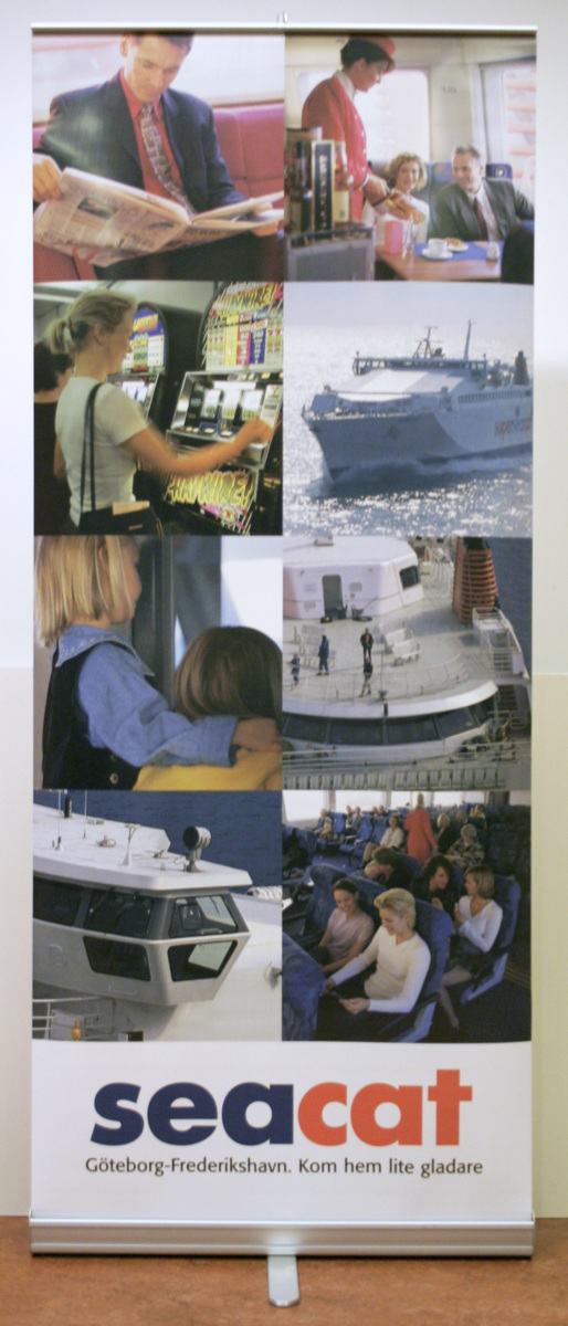 a/ Expanderbart skyltställ, bestående av en behållare L 86; H 10; B 10 cm. I behållaren finns en plastöverdragen skylt (85x200 cm) upprullad på en fjäderbelastad rulle samt ett fack för en tredelad stång. Behållarens undersida har en platt stång fastsatt på mitten och vridbar. Denna vrides 90 grader som stöd. Stången sätts i ett hål i behållaren, skylten dras ut och krokas fast på stångens övre ända. Skylten visar 8 st bilder i rader om 2 på Superseacat interiört och exteriört. Under bilden finns text: 'seacat, Göteborg - Frederikshavn. Kom hem lite gladare' b/ Fodral till skyltställ av svart textil försett med blixtlås runt ena ändan samt bärremmar mitt på långsidan och över den öppningsbara ändan. Fodralet är märkt '8 olika bilder'.