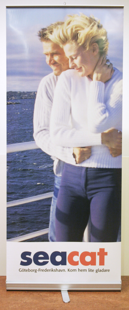 a/ Expanderbart skyltställ, bestående av en behållare L 86; H 10; B 10 cm. I behållaren finns en plastöverdragen skylt (85x200 cm) upprullad på en fjäderbelastad rulle samt ett fack för en tredelad stång. Behållarens undersida har en platt stång fastsatt på mitten och vridbar. Denna vrides 90 grader som stöd. Stången sätts i ett hål i behållaren, skylten dras ut och krokas fast på stångens övre ända. Skylten visar en bild med ett par stående vid en reling. Under bilden finns text: 'seacat, Göteborg - Frederikshavn. Kom hem lite gladare' b/ Fodral till skyltställ av svart textil försett med blixtlås runt ena ändan samt bärremmar mitt på långsidan och över den öppningsbara ändan. Fodralet är märkt 'Förälskat parstor bild'.