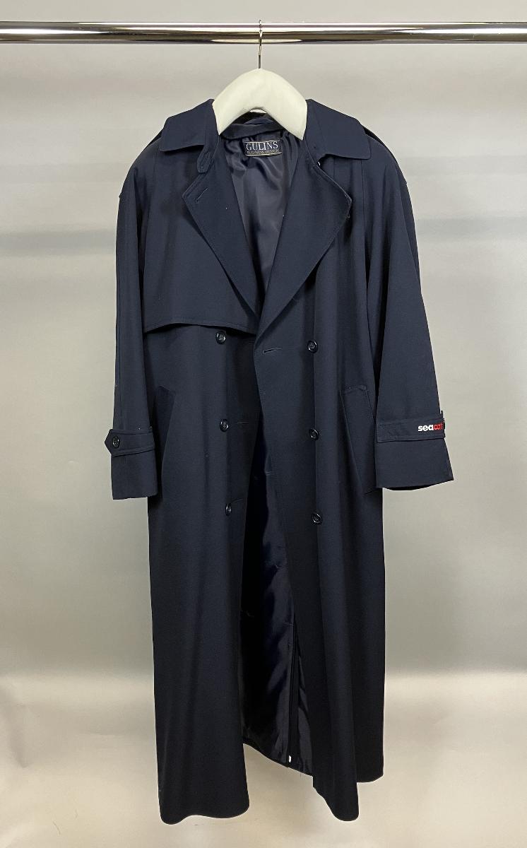 Till uniform. Mörkblå dubbelknäppt rock med löstagbart foder och tillhörande skärp med spänne. På vänster arms slejf finns 'seacat' broderat 'sea' med vit och 'cat' med röd tråd.