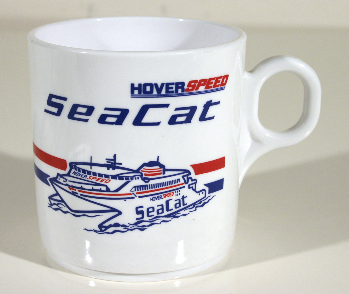 Rak vit plastmugg med grepe. På båda sidorna finns en enkel avbildning av en HSC Seacat. Över bilden texten: 'HOVERSPEED SeaCat'.