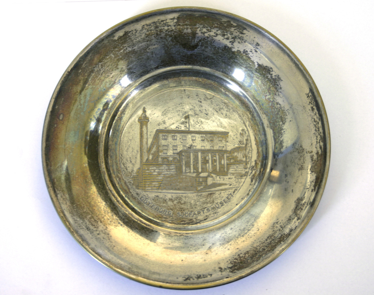 Minnestallrik av försilvrad mässing med präglad bild av Sjöfartsmuseet och text 'Göteborg. Sjöfartsmuseet'. Tallriken är försedd med ett pålött tavelhänge.