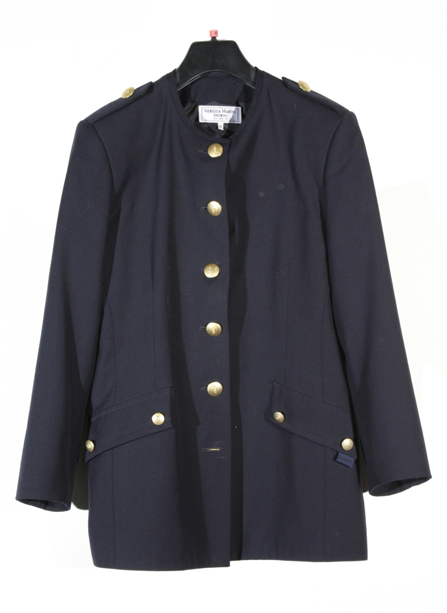 Mörk blå jacka av ylle och polyester med polyesterfoder. Jackan är kraglös och gåt att knäppa ända upp till halsen Två snedställda ficklock med två metallknappar men utan fickor. På det vänstra locket finns en liten påsydd fritt hängande etikett med bokstäverna 'HS',