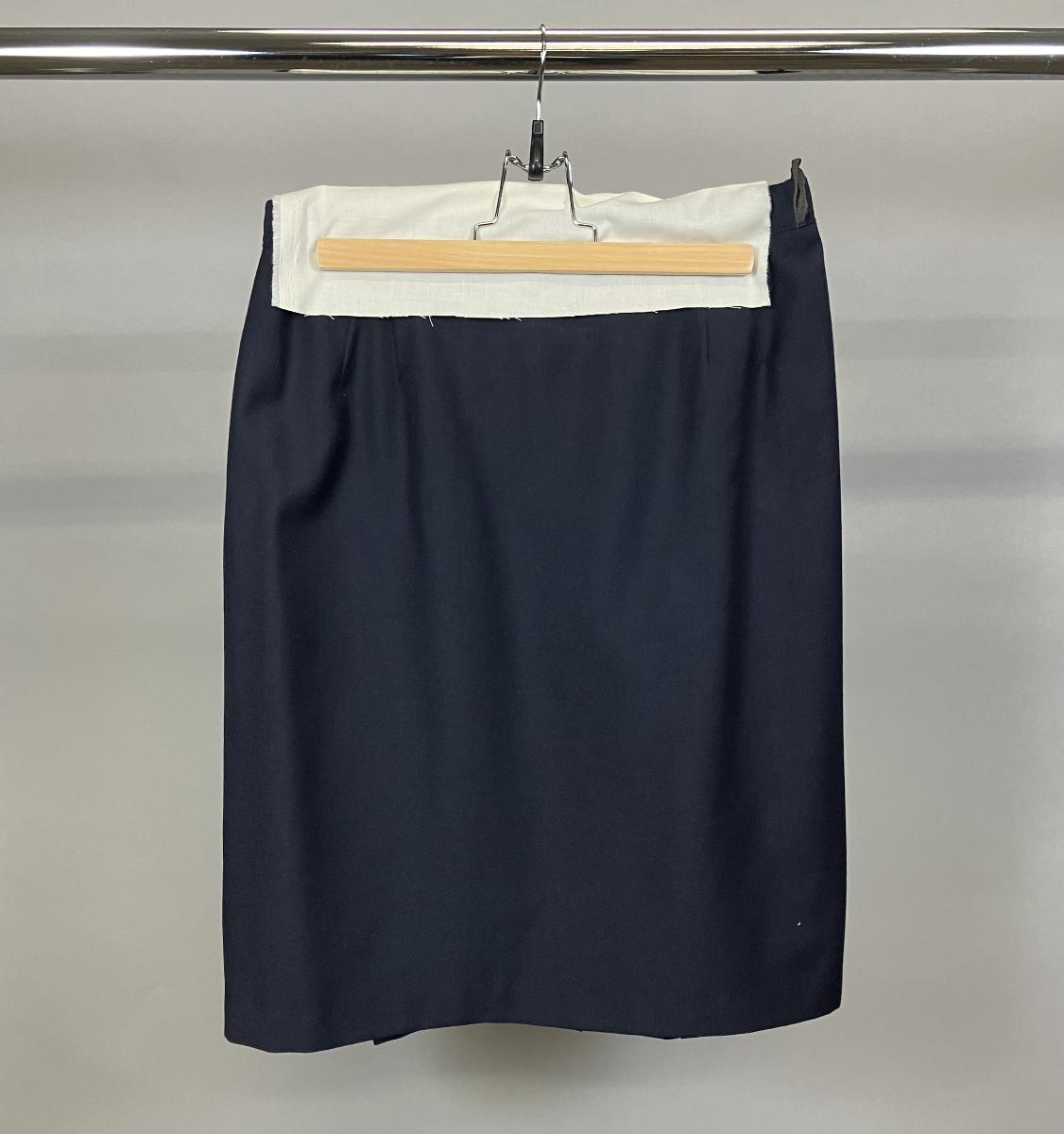 Mörkblå kjol med knapp och dragkjedja baktill och ett resåravsnitt på varje sida. 3 veck bak.