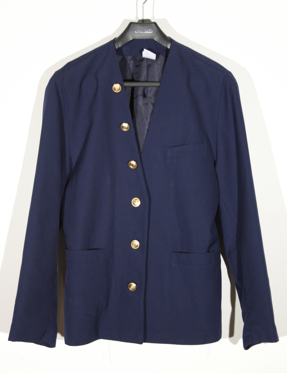 Jacka, mörkblå v-skuren utan slag och krage. Jackan har sex knappar varav tre går att använda. Knapparna är av mässing med baksida av plast. Knapparna är av Colorlines utförande.