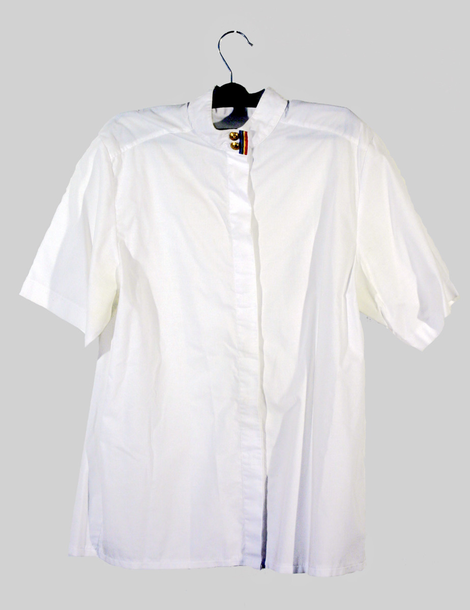 Helkäppt (dolda knappar), kortärmad blus med ståkrage i polyester. Kragen knäpps med två metallknappar av Colorlines modell. Ändan på knapphålssidan täcks av band med fyra färgade ränder. För dräktuniform.