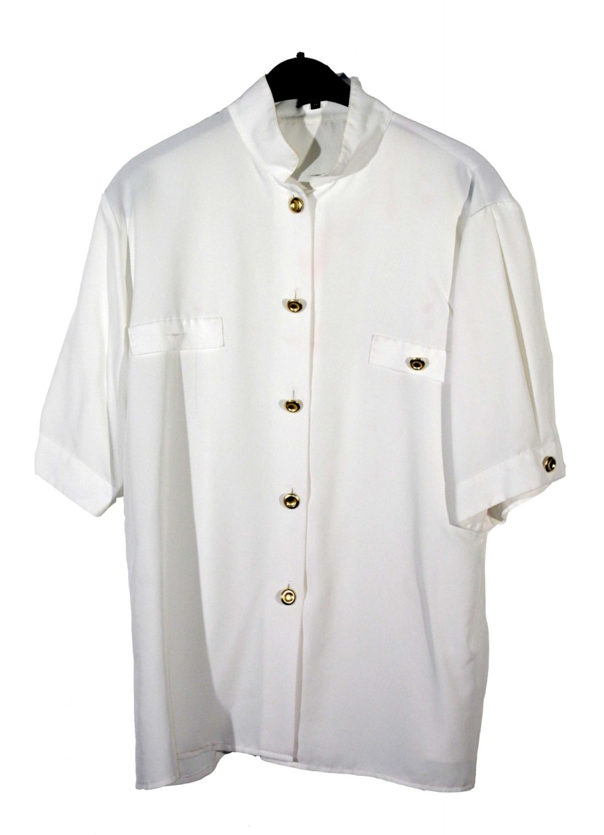 Beige, helknäppt och kortärmad blus med runda konkava mässingsknappar. För dräktuniform.