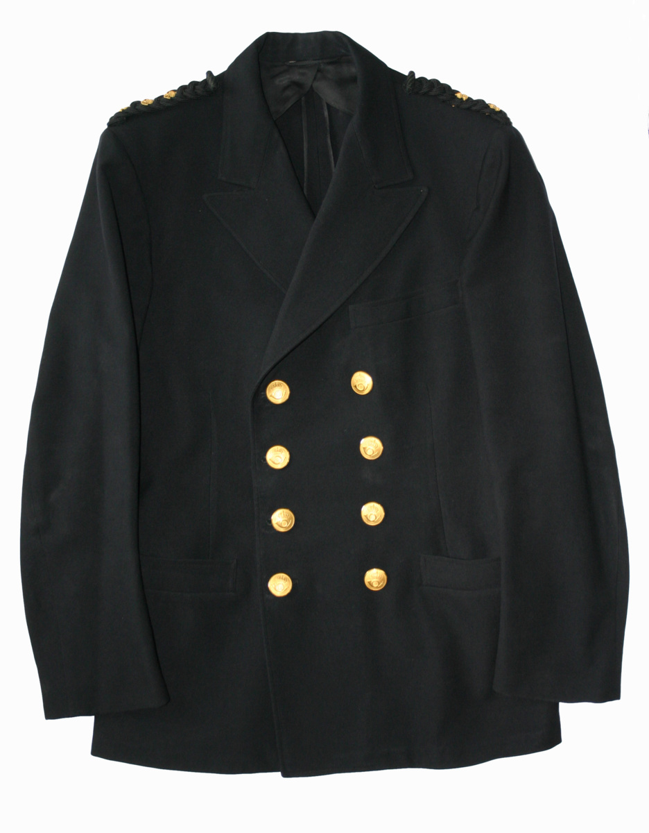 Tillhörande Sjöpostmästaruniform. Svart dubbelknäppt uniformskavaj. Två rader med fyra metallknappar dekorerade med krönta posthorn. Flätade svarta axelklaffar av textiltråd försedda med tre krönta posthorn av gulmetall. (På den ena saknas ett.)