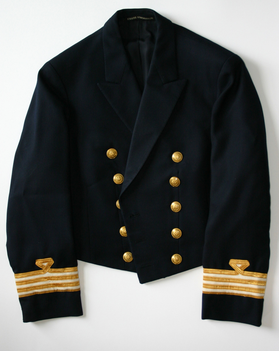 Mässjacka för chefsintendent i mörkblått tyg. Jackan är försedd med två rader med vardera fem av Broströmskoncernens metallknappar. Nedtill på ärmarna finns gradbeteckningar bestående av fyra galoner på vit botten varav den översta har en trekantig ögla och den nedersta är smal.