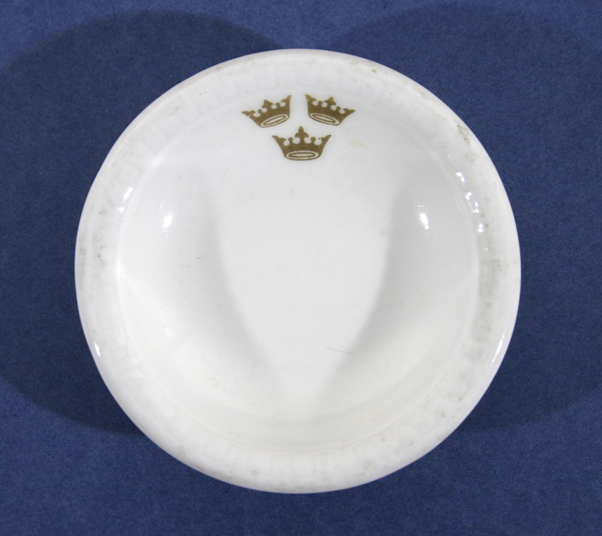 Runt vitglacerat askfat mönstrad kant. På brättet tre kronor av guld. På undersidan Gustavsbergs logo samt texten 'Ben porslin C12'.