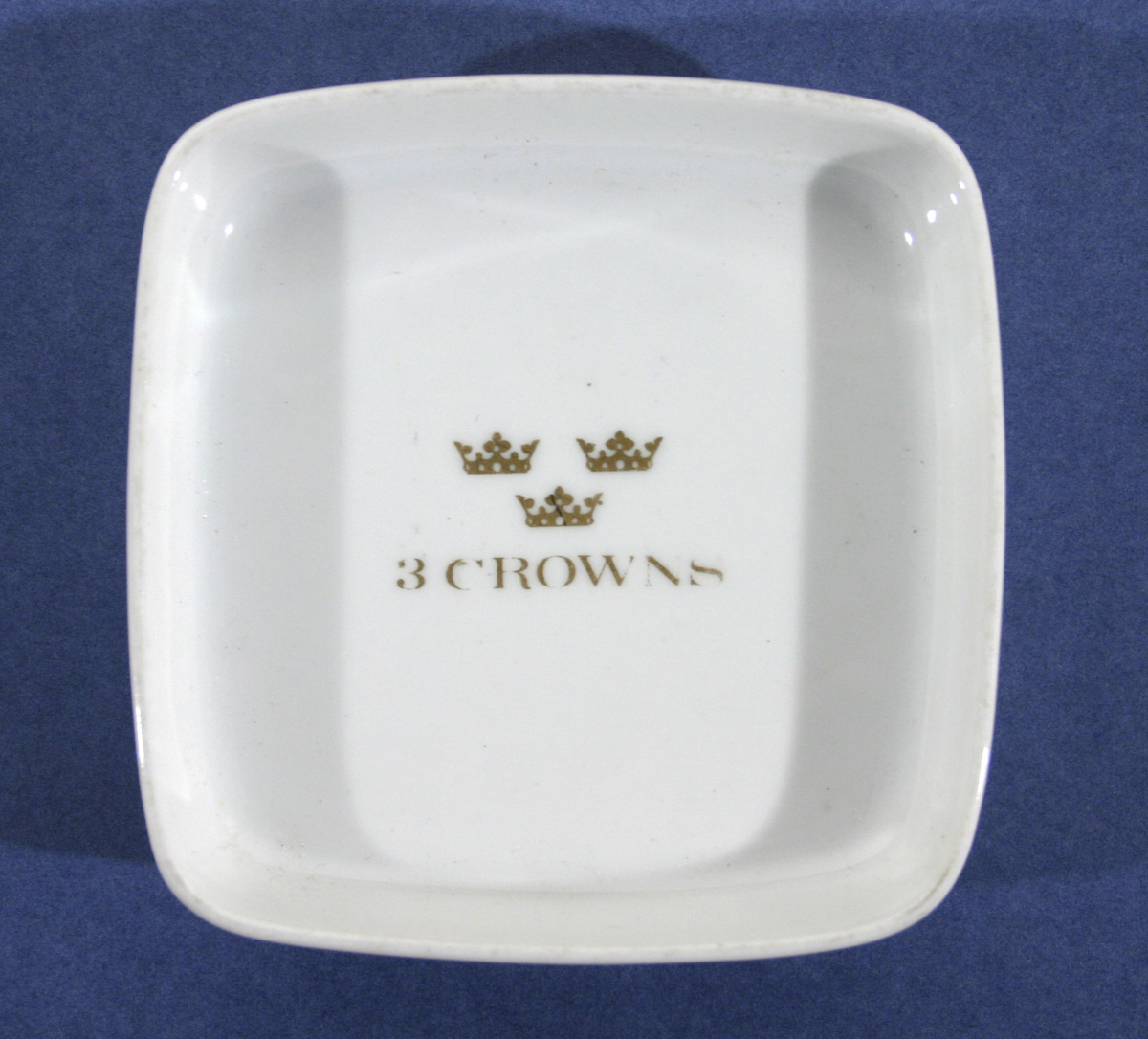 Fyrkantigt askfat med vit glasyr med något konvexa sidor. I mitten tre kronor och texten '3 crowns' med guld som delvis fallit bort. På undersidan en logotypi grönt 'Bauscher, Weiden, BW' under glasyren samt en i blått 'Ove C. Bjerregaard' över glasyren. Ev. har askfatet inte tillhört Svenska Amerika Linien med tanke på kronornas placering och namnet 3 crowns.