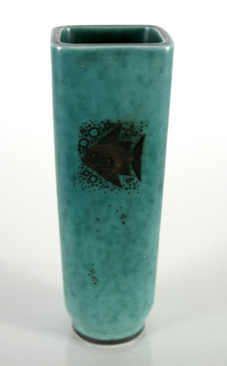 Fyrkantig rak vas med rundade hörn stående p en låg rund fot. En inbrännd metallrand runt öppningen samt runt foten. På ena sidan tre inbrännda kronor och på motstående sida en inbränd fisk.