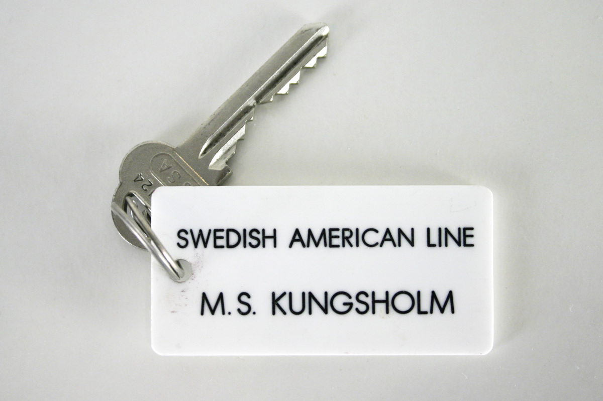 Sjustifts ASSA cylindernyckel sittande på en nyckelring tillsammans med en nyckelbricka. Nyckeln är märkt 041.U24 357E. Nyckelbrickan är rektangulär och tillverkad av plast. På nyckelbrickans båda sidor finns graverad och med svart färg ifylld text. På den ena sidan står: 'SWEDISH AMERIKAN LINE, M.S. KUNGSHOLM' och på den andra sidan står: 'ROOM No U24'