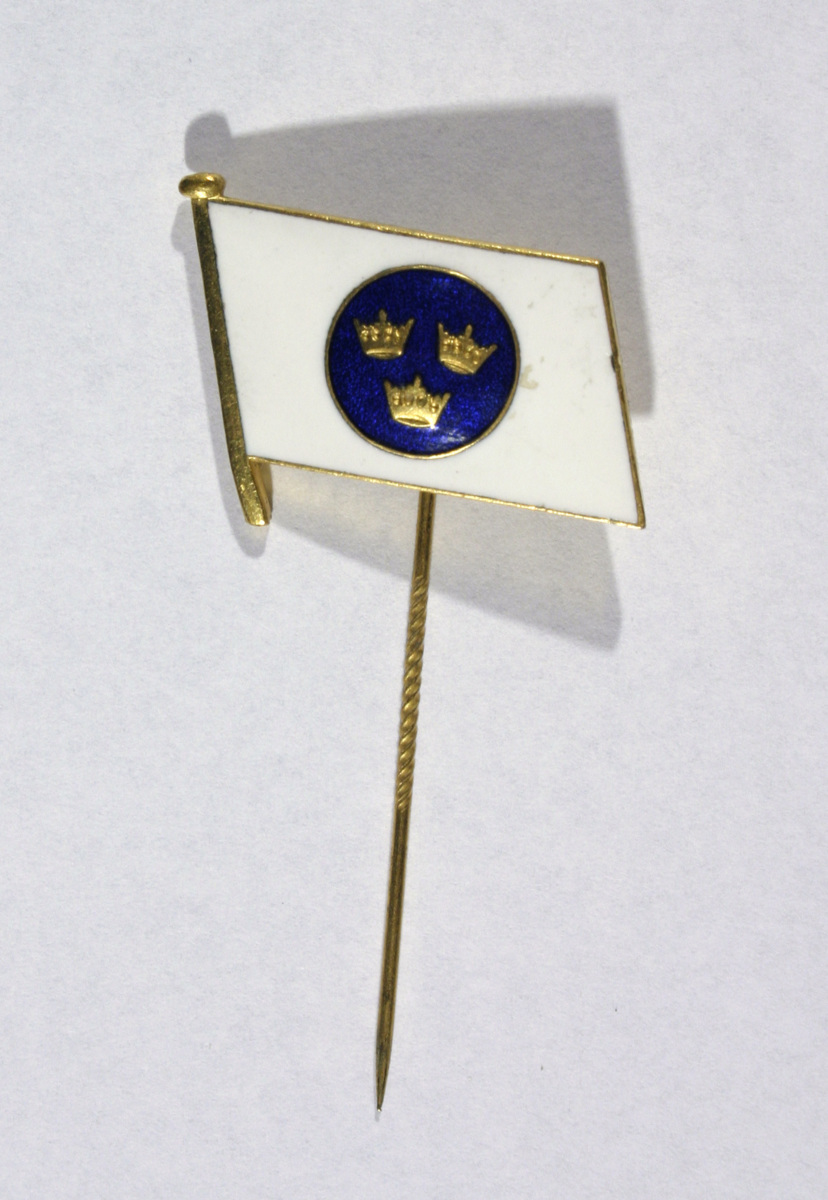 Rockslagsmärke med nål i form av en snedställd rederiflagga på en kort stång. Märket är emaljerat och gjort av gulmetall. Blå bakgrung med ett blått cirkelfärgat fält i mitten. Cirkeln innehåller tre guldfärgade kronor.