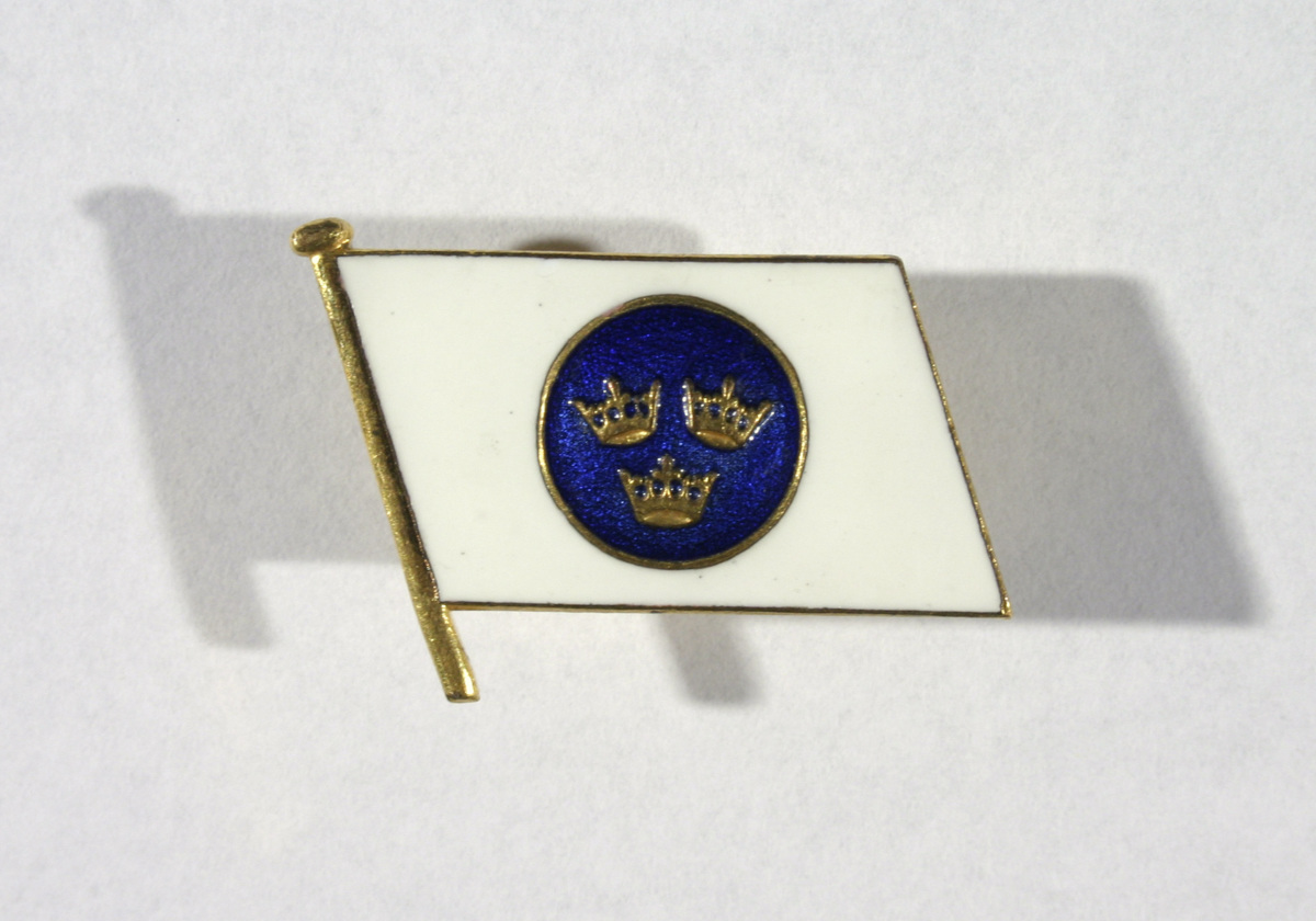 Emaljerat emblem av gulmetall i form av en rederiflagga med kort stång. Flaggan är vit med ett mörkblått cirkelformat konvext fält innehållande tre kronor. Kronor och kanter av utstickande ren metall.