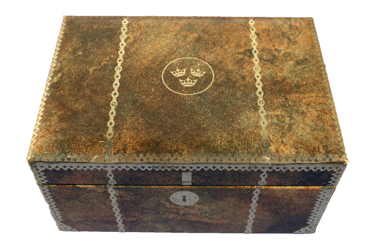 Etui med gångjärnsförsett lock. Etuiet är klätt med ett grön, röd och brunspräckligt lager samt är dekorerat med guldfärg föreställande kantlister , nyckelskylt och handag för att likna en kista. På locket tre kronor omslutna av en cirkel.