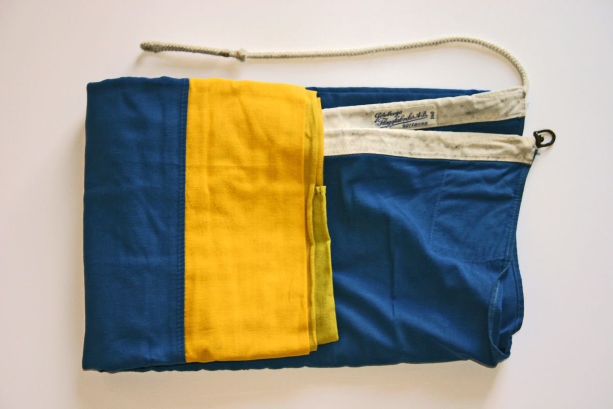 Svensk flagga som förvarats tillsammans med en SAL flagga och kopior på fartygsregistreringshandlingar i en läderpärm.