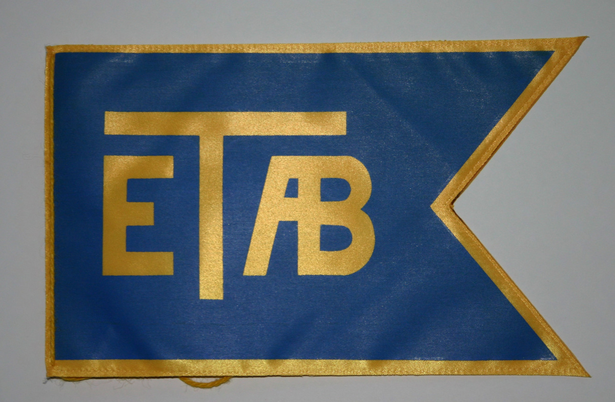 Tvåtungad bordsflagga av gul konstfiber med pålagd blå färg somlämnar bokstäverna 'ETAB' samt en gul kant runt flaggan. Flaggan består av två ihopsydda delar. En gul lina är fäst i stångkanten genom två genomgående hål.