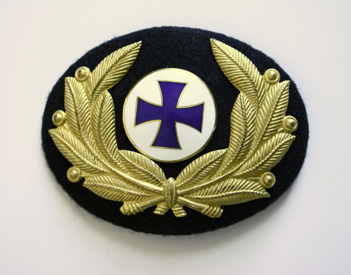 Oval tygklädd och buktande metallplatta försedd med ett runt rederimärke omslutet av en lövkrans gjuten av metall.
