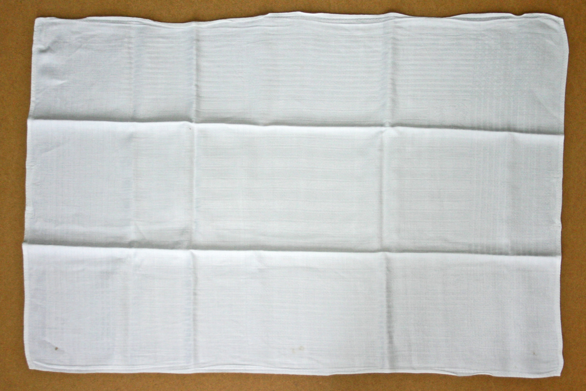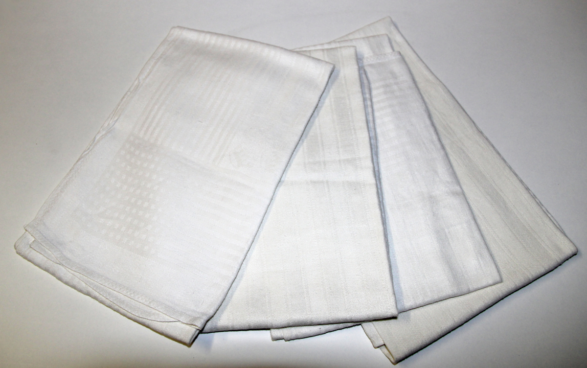 Linnehandduk med fåll och hängband på båda kortsidorna. Invävda ränder och kvadrater, på fyra ställen firmamärket tre kronor samt på båda kortsidorma "Svenska Amerika Linjen 1974".