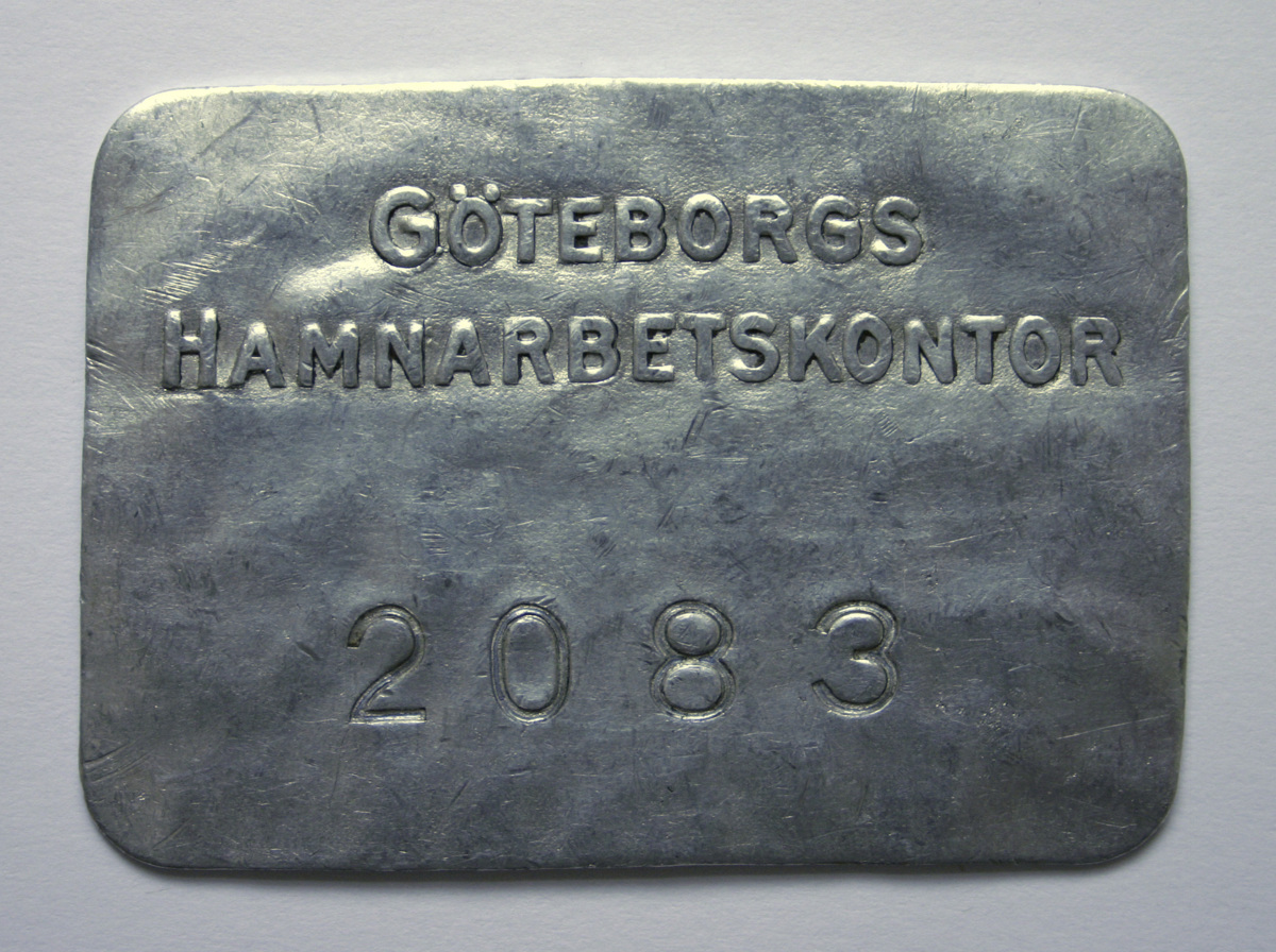 Rektangulär bricka av aluminiumplåt med avrundade hörn. Längst övre långsidan står det ”Göteborgs hamnarbetskontor” i relief och där under är numret 2083 stansat.