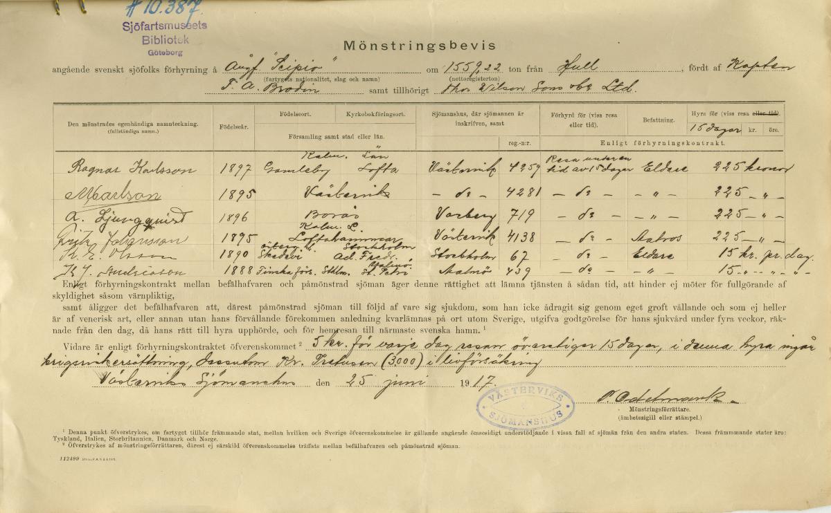 Gå tillbaka till sökLägg till i Min samlingKopiera länkSkriv utMönstringsbevisSEIPIO, ångfartygAktörerAlbin Brodin (1870 - 1947), BrukareKategorimönstringsbevis (Dokument, handlingar, personliga handlingar)FartygSEIPIO, ångfartygFartygstypångfartygDateringTillkomsttid 1917-06-25InventarienummerSMG10387UtställdInte utställd på museet