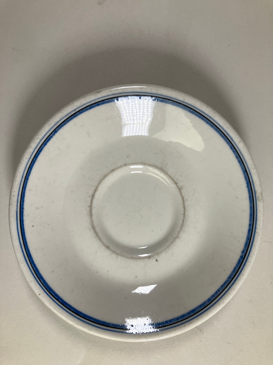 Rederiporslin, mockakaffekopp med fat, som tillhört Ostasiatiska kompani, Köpenhamn. Märkt med bolagets flagg. Koppen tillverkat av Baucher Weiden för Glasmagasinet Norrevold1923. Fatet med samma dekor stämplat Kopenhamnsporslinfabrik Danmark.