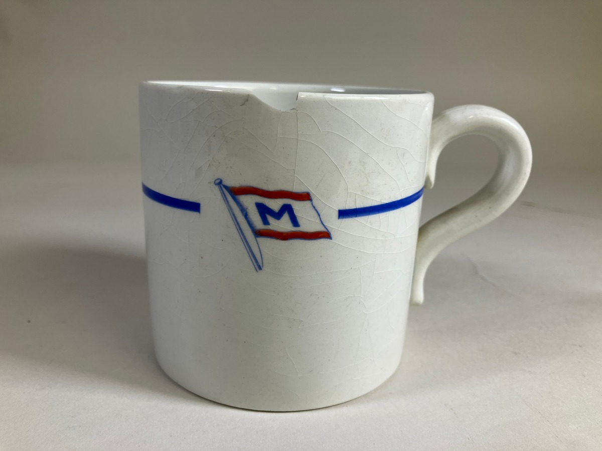 Gå tillbaka till sökLägg till i Min samlingKopiera länkSkriv utMuggAktörerYngve Eiserman (1873 - 1955), Förvärvat frånKategoriserveringsutrustning (Inredning, husgeråd) dryckeskärl (Inredning, husgeråd) Övrig fartygsutrusning (Fartygsutrustning)GeografiBrukats: Bergen (Europa, Norge, Hordaland)InventarienummerSMG10531UtställdInte utställd på museetBeskrivningRederiporslin som tillhört AB Morwinckel Bergen, m/s Grena. Mlå rand med bolagsflagg i rött och blått.