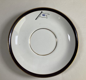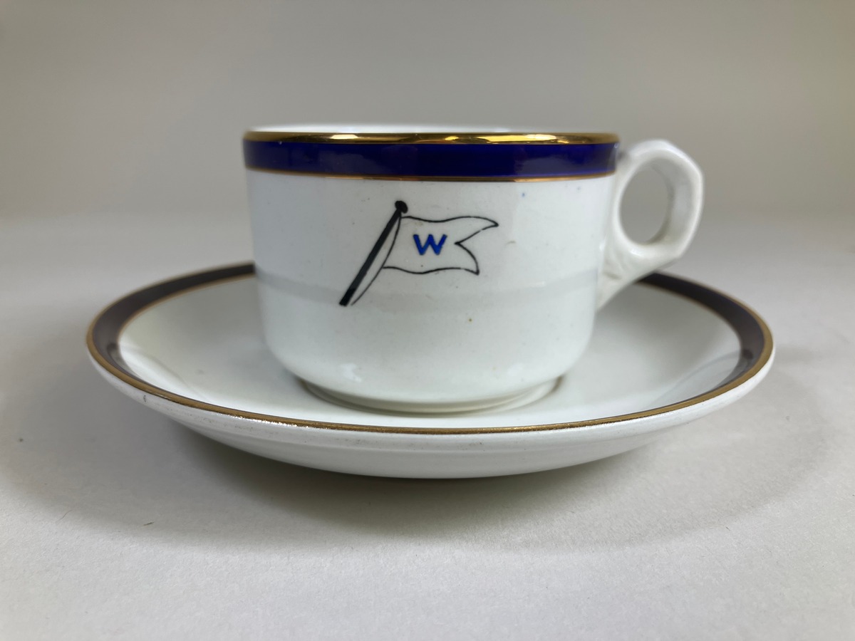 Kaffekopp med fat (mocka) som tillhört Wilh. Wilhelmsens, Oslo, dekorerad med bolagsflagg, kantdekor i blått och guld. Tillverkad av Rörstrands porslinsfabrik.
