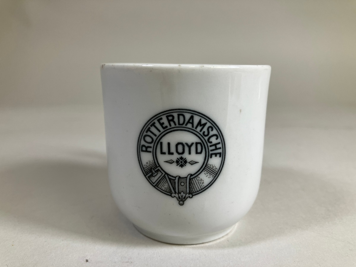Kaffekopp (mocka) som tillhört Rotterdamsche Lloyd. Svart dekor med band och bolagsnamn.