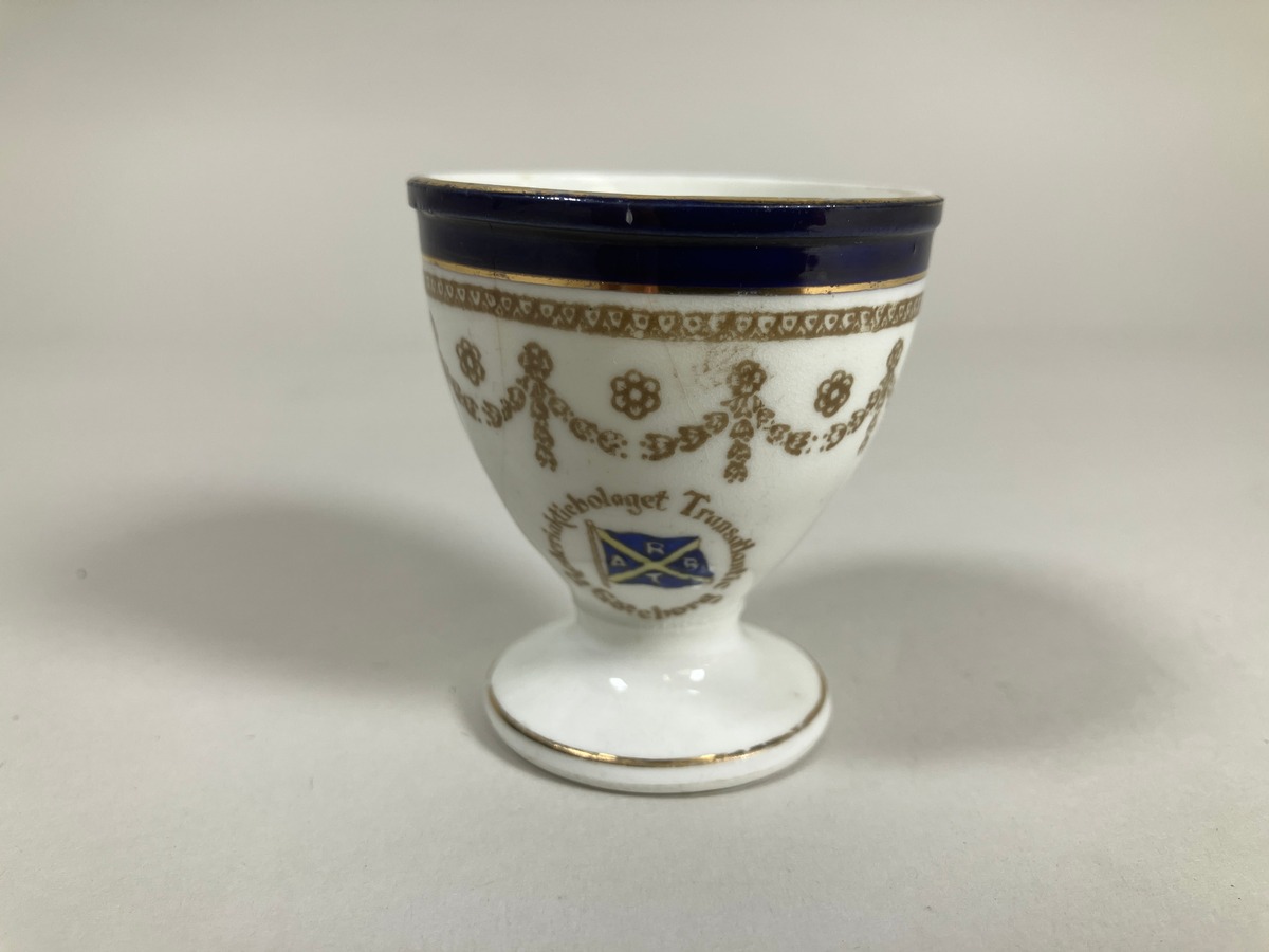 Gå tillbaka till sökLägg till i Min samlingKopiera länkSkriv utÄggkoppAktörerRörstrand, Tillverkare Rederi AB Transatlantic (RABT) (1904 - 1994), Brukare Yngve Eiserman (1873 - 1955), Förvärvat frånKategoriserveringskärl (Inredning, husgeråd)InventarienummerSMG10561UtställdInte utställd på museetBeskrivningÄggkopp som tillhört Rederi AB Transatlantic. Dekor i blått och guld samt bolagsflagg. Tillverkad av Rörstrands porslinsfabrik.