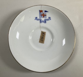 Dekorerad med guldkant och märke med bolagsflagg. Tillverkad av Royal Vitrans England