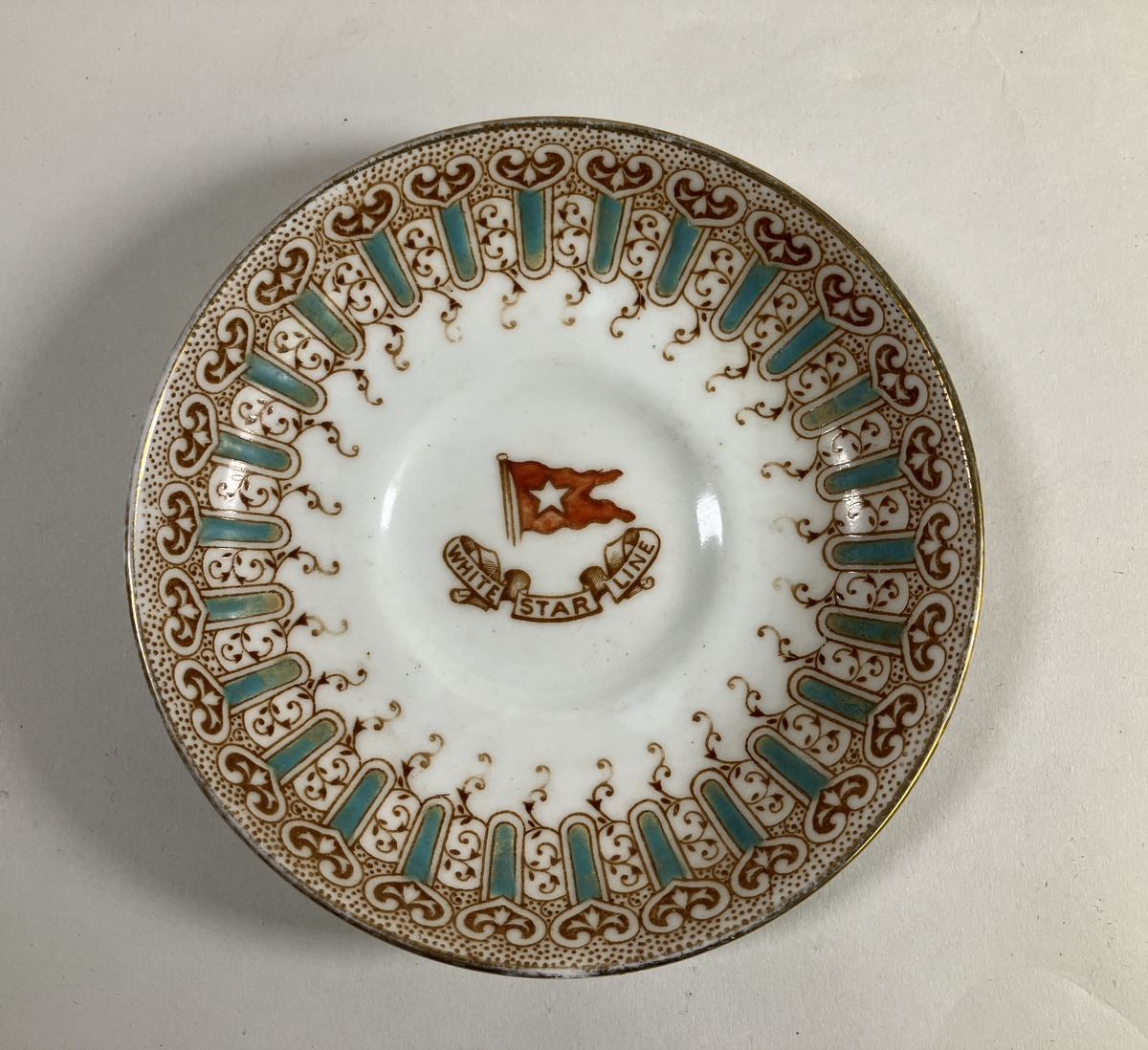 Tefat med dekor" Wisteria" använt i 1:a klass ombord på RMS TITANIC, RMS OLYMPIC tillhörande White Star Line. Centralt dekorerad med bolagsflagg och rederiets namn i guld samt kantdekor i guld, grönt och rött.