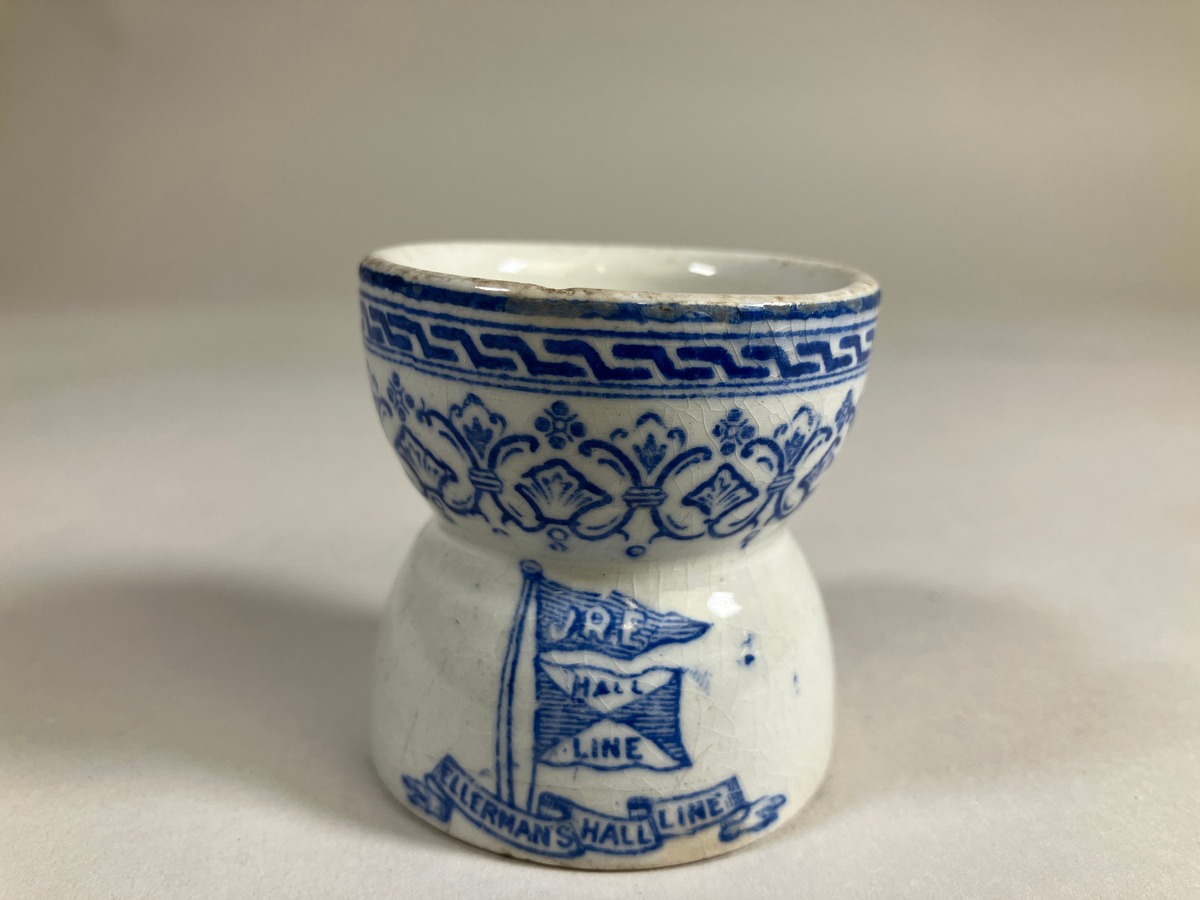 Gå tillbaka till sökLägg till i Min samlingKopiera länkSkriv utÄggkoppAktörerYngve Eiserman (1873 - 1955), Förvärvat frånKategoriserveringsutrustning (Inredning, husgeråd) Övrig fartygsutrusning (Fartygsutrustning)DimensionerHöjd 4,50 cm Diameter 4,50 cmInventarienummerSMG10599UtställdInte utställd på museetBeskrivningÄggkopp som tillhört Ellerman Hall Line. Rikt dekorerad blå dekor i form av mönsterbård och bolagsflagg med band