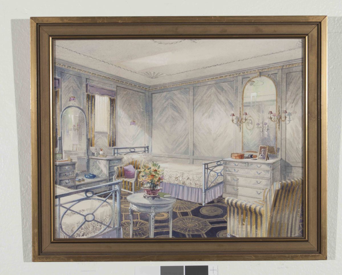 Akvarellmålning, sovrum i lyxhytt i 1:a klass